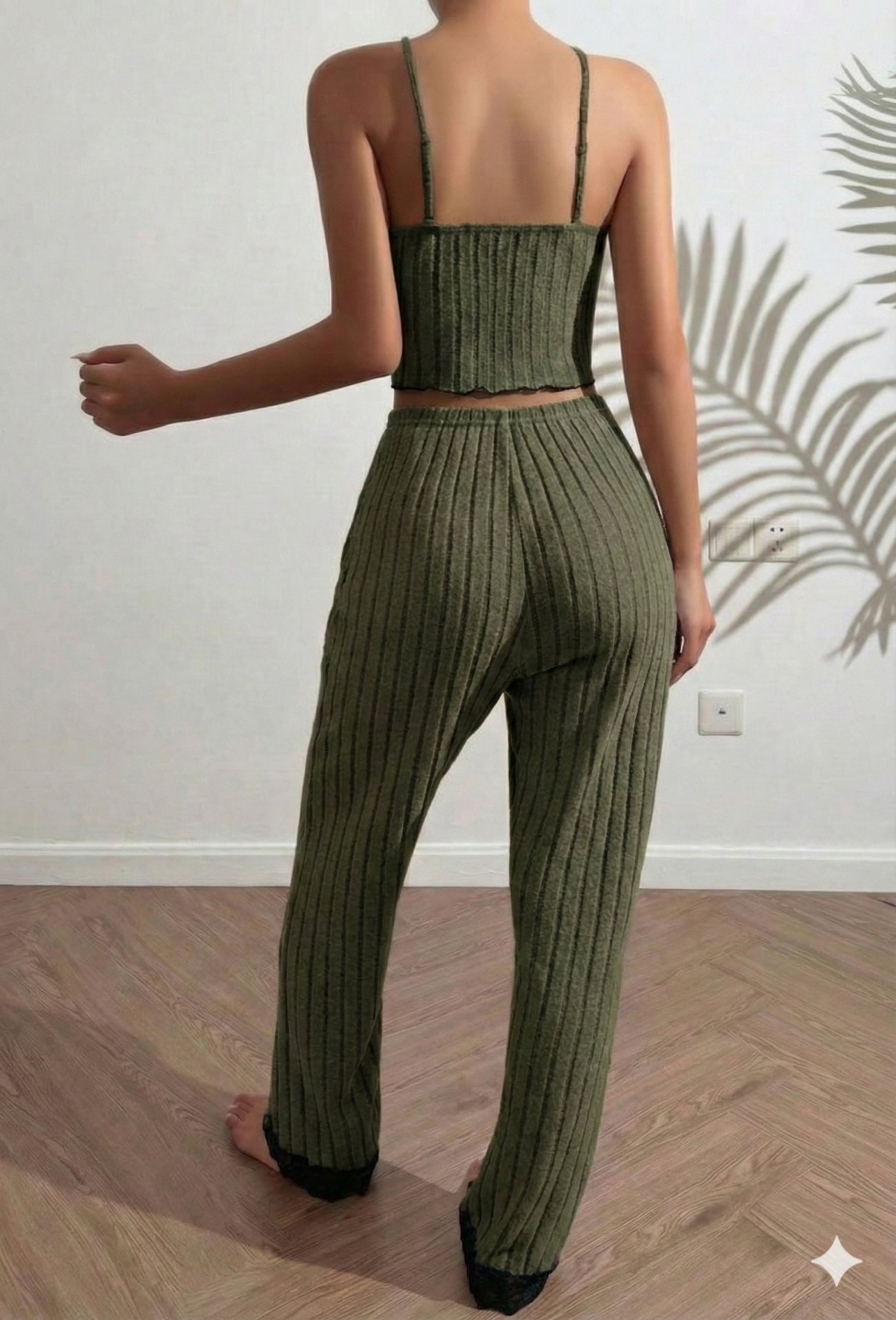 Askılı Dantelli ve Fiyonk Detaylı Pijama Takımı Haki - XL