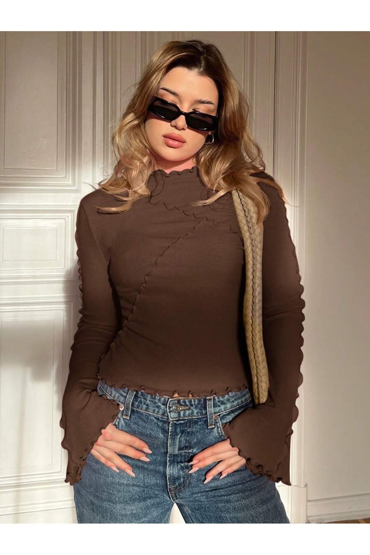 Kadın İspanyol Kol Fitilli Bluz Kahverengi - XL