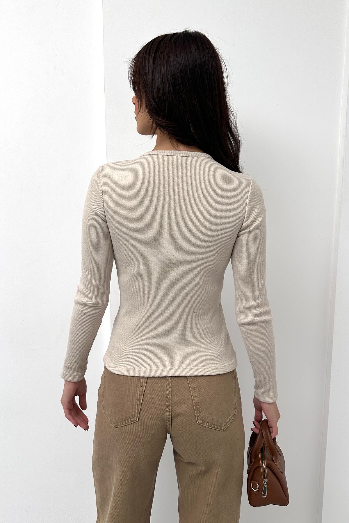 Kadın Uzun Kollu Patlı Fitilli Kaşkorse Bluz Bej - M