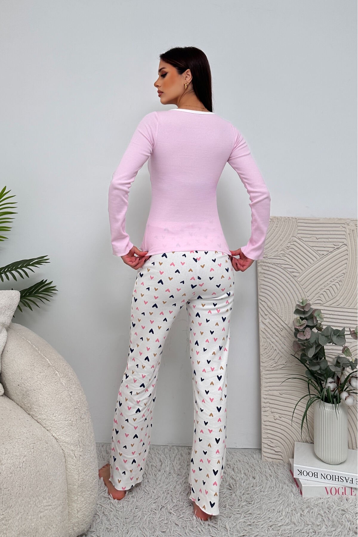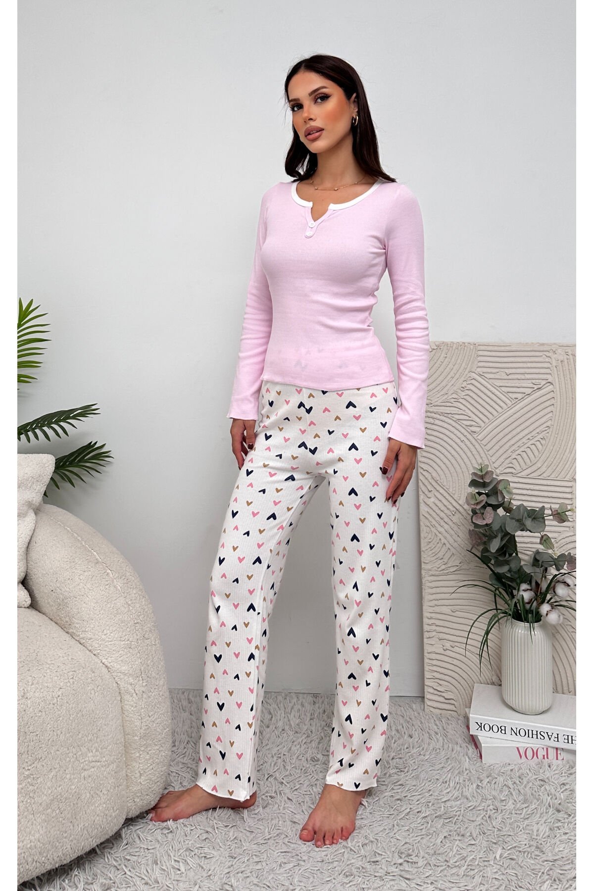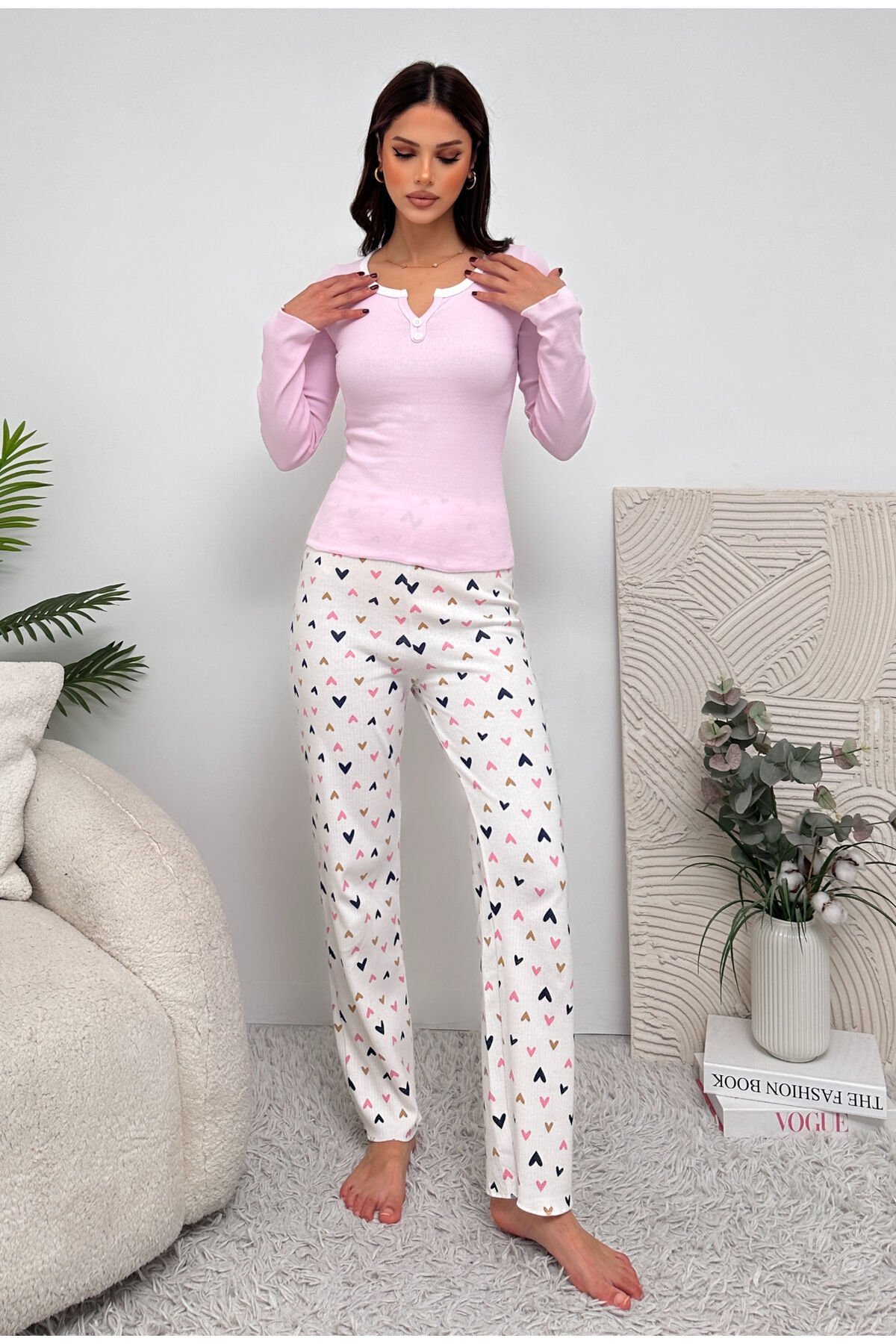 - Pamuklu kumaşı sayesinde gün boyu rahat bir kullanım sunar.; - V yaka tasarımı ile şık ve modern bir görünüm sağlar.; - Uzun kol ve bol paça kesimi, konforlu bir uyku deneyimi için idealdir.; - Lastikli bel yapısı sayesinde vücuda mükemmel uyum sağlar ve hareket özgürlüğü tanır.; - Örgü dokuma tipi, pijama takımına dayanıklılık ve yumuşaklık katar.; - Fiyonk detayları ile feminen dokunuşlar ekleyerek stilinizi tamamlar.; - 2 in 1 ürün tipi, pratik kullanım için hem üst hem de alt parçayı içerir.; - Tüm mevsimler için uygun olan bu takım, yılın her döneminde konforunuzdan ödün vermezsiniz.; - Homewear koleksiyonuna ait bu parça, evdeki rahatlığınızı artırır.; - Türkiye'de üretilen bu ürün, yerel ekonomiye destek olurken kaliteli bir deneyim sunar.; - Sürdürülebilirlik detayı ile çevre dostu bir seçim yapmış olursunuz.;- Pamuklu kumaşı sayesinde gün boyu rahat bir kullanım sunar.; - V yaka tasarımı ile şık ve modern bir görünüm sağlar.; - Uzun kol ve bol paça kesimi, konforlu bir uyku deneyimi için idealdir.; - Lastikli bel yapısı sayesinde vücuda mükemmel uyum sağlar ve hareket özgürlüğü tanır.; - Örgü dokuma tipi, pijama takımına dayanıklılık ve yumuşaklık katar.; - Fiyonk detayları ile feminen dokunuşlar ekleyerek stilinizi tamamlar.; - 2 in 1 ürün tipi, pratik kullanım için hem üst hem de alt parçayı içerir.; - Tüm mevsimler için uygun olan bu takım, yılın her döneminde konforunuzdan ödün vermezsiniz.; - Homewear koleksiyonuna ait bu parça, evdeki rahatlığınızı artırır.; - Türkiye'de üretilen bu ürün, yerel ekonomiye destek olurken kaliteli bir deneyim sunar.; - Sürdürülebilirlik detayı ile çevre dostu bir seçim yapmış olursunuz.;