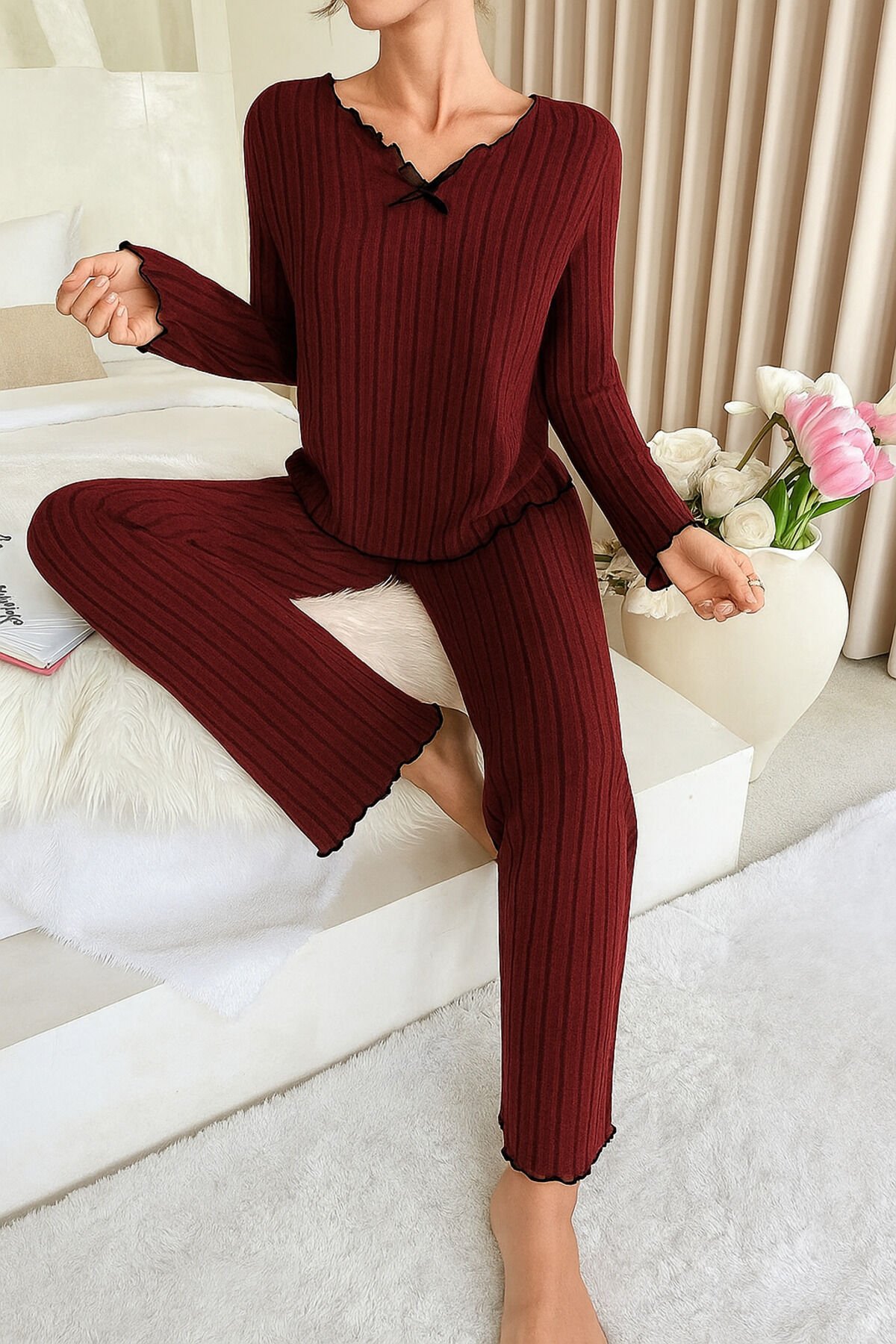 - Pamuklu kumaşı sayesinde gün boyu rahat bir kullanım sunar.; - V yaka tasarımı ile şık ve modern bir görünüm sağlar.; - Uzun kol ve bol paça kesimi, konforlu bir uyku deneyimi için idealdir.; - Lastikli bel yapısı sayesinde vücuda mükemmel uyum sağlar ve hareket özgürlüğü tanır.; - Örgü dokuma tipi, pijama takımına dayanıklılık ve yumuşaklık katar.; - Fiyonk detayları ile feminen dokunuşlar ekleyerek stilinizi tamamlar.; - 2 in 1 ürün tipi, pratik kullanım için hem üst hem de alt parçayı içerir.; - Tüm mevsimler için uygun olan bu takım, yılın her döneminde konforunuzdan ödün vermezsiniz.; - Homewear koleksiyonuna ait bu parça, evdeki rahatlığınızı artırır.; - Türkiye'de üretilen bu ürün, yerel ekonomiye destek olurken kaliteli bir deneyim sunar.; - Sürdürülebilirlik detayı ile çevre dostu bir seçim yapmış olursunuz.;- Pamuklu kumaşı sayesinde gün boyu rahat bir kullanım sunar.; - V yaka tasarımı ile şık ve modern bir görünüm sağlar.; - Uzun kol ve bol paça kesimi, konforlu bir uyku deneyimi için idealdir.; - Lastikli bel yapısı sayesinde vücuda mükemmel uyum sağlar ve hareket özgürlüğü tanır.; - Örgü dokuma tipi, pijama takımına dayanıklılık ve yumuşaklık katar.; - Fiyonk detayları ile feminen dokunuşlar ekleyerek stilinizi tamamlar.; - 2 in 1 ürün tipi, pratik kullanım için hem üst hem de alt parçayı içerir.; - Tüm mevsimler için uygun olan bu takım, yılın her döneminde konforunuzdan ödün vermezsiniz.; - Homewear koleksiyonuna ait bu parça, evdeki rahatlığınızı artırır.; - Türkiye'de üretilen bu ürün, yerel ekonomiye destek olurken kaliteli bir deneyim sunar.; - Sürdürülebilirlik detayı ile çevre dostu bir seçim yapmış olursunuz.;